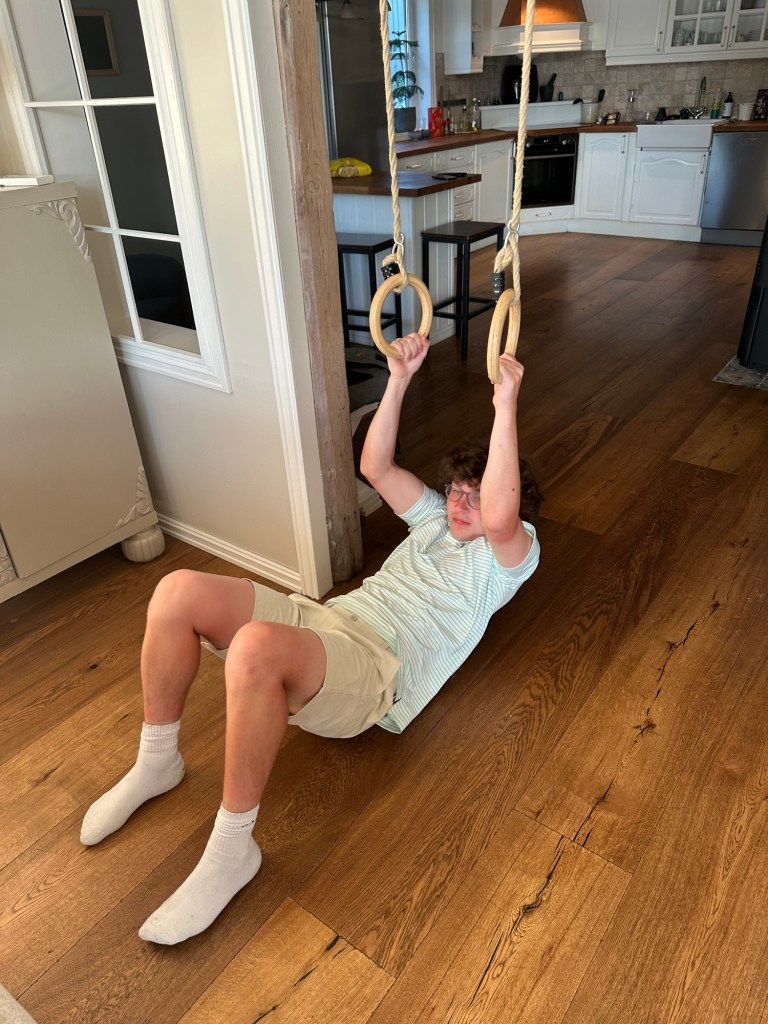 Logan and Greg had done a few pull ups from the rings hanging in the house on Tuesday night with relative ease. After today’s long adventures Logan isn’t performing as well.