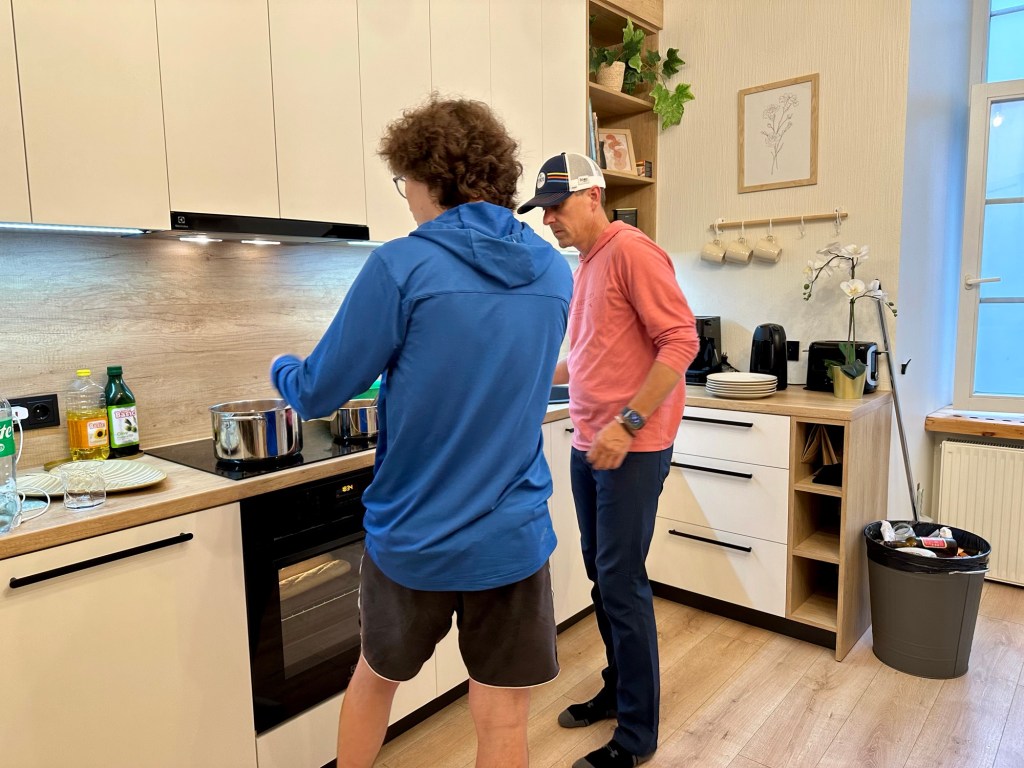 Greg and Logan prepared dinner. The menu was penne pasta with red sauce (some with meat and some without), Caesar salad, and garlic bread.