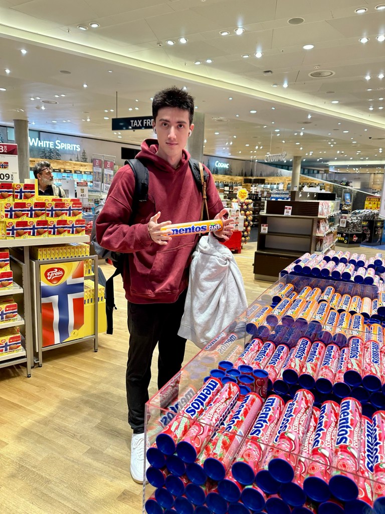 We headed through the duty free store and Jake seemed super tempted to buy this small thing of mentos. (Not really…I made him pose.)