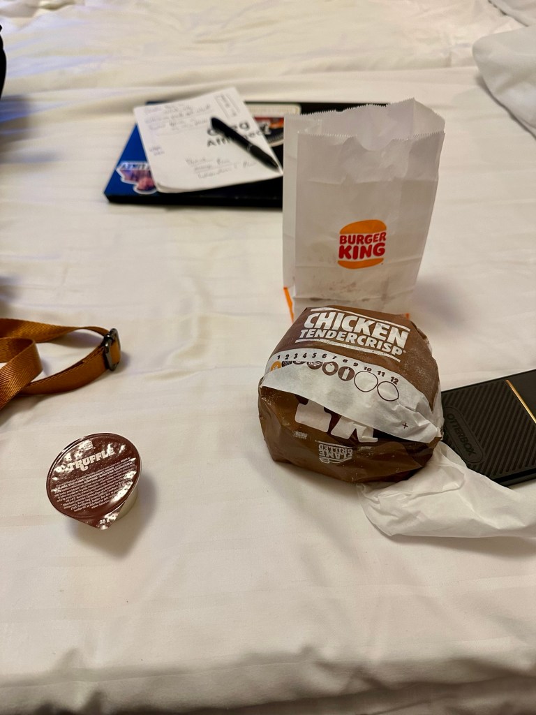 So here I sit on the bed eating Burger King at 10:30pm at night. I don’t know what I was thinking. It’s still light outside, the flower shops were still open, people were out and about. I should have come here and gone straight to bed! Oh well, I’m sure I will sleep better with this chicken sandwich and onion rings…right?