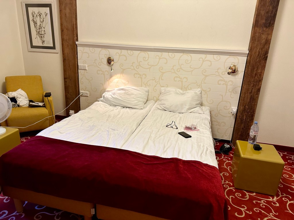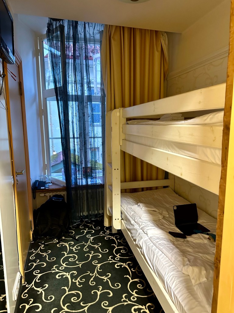We have three rooms at this hotel. One for me and Greg, and then two tiny rooms with bunk beds. Greg was so happy to get three rooms with free Breakfast for 267.00.