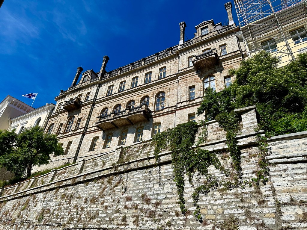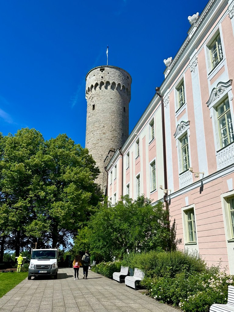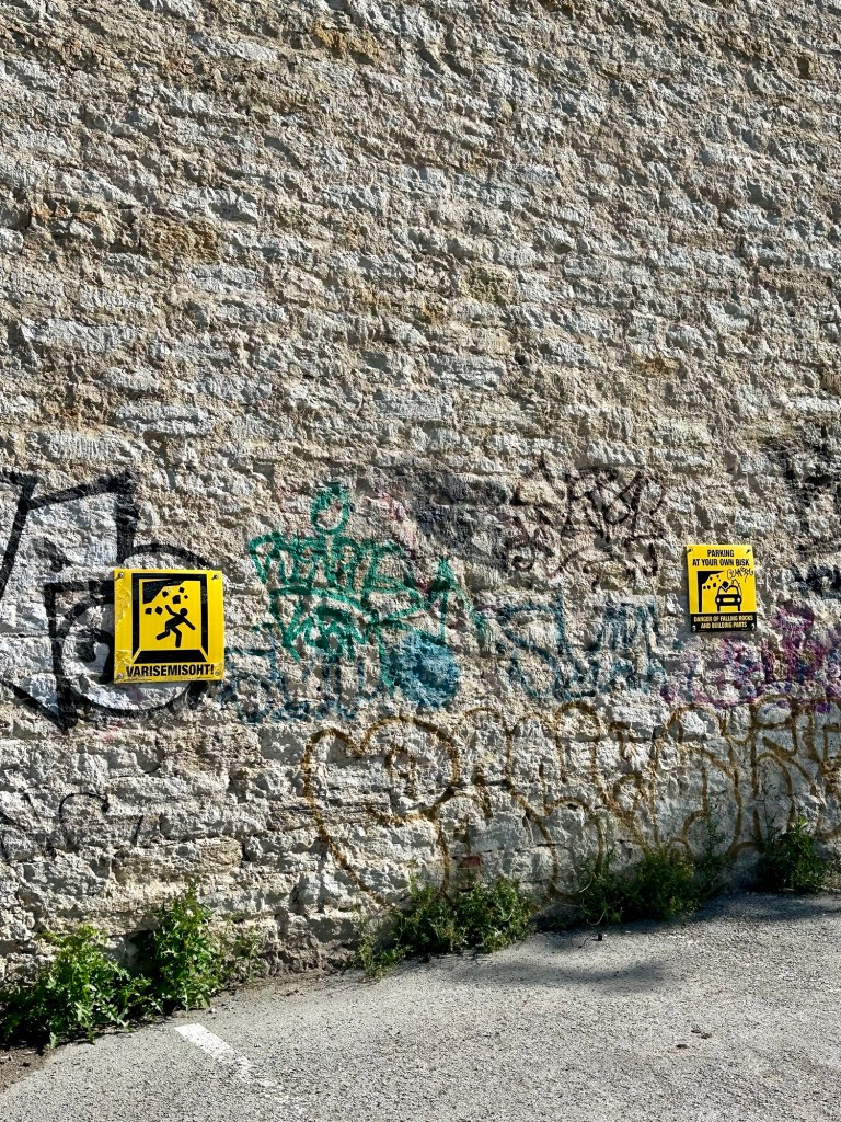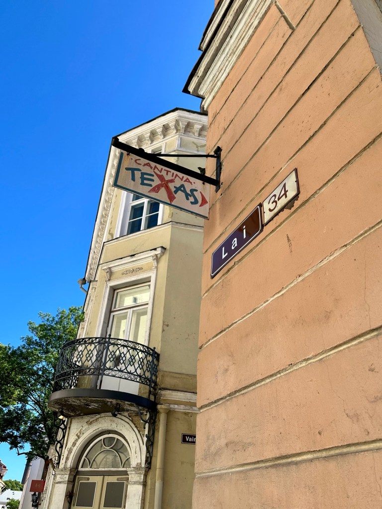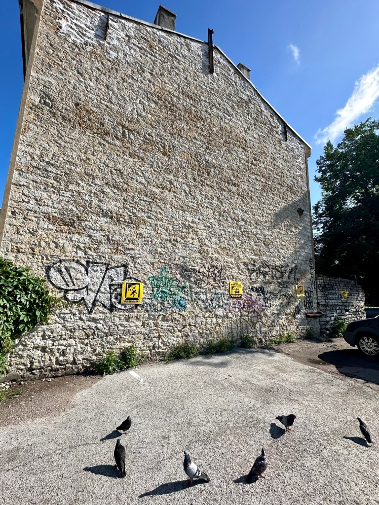 View of the Parliament building built into the wall Architecture with a lady hanging out her window Interesting mix of beverage offeringsSuper fancy downspouts We think this sign means don’t steal purses. Logan doesn’t speak Estonian