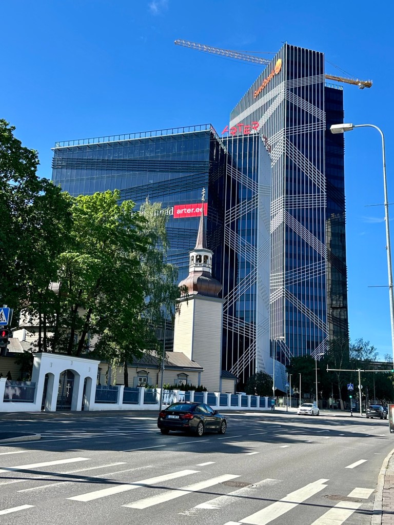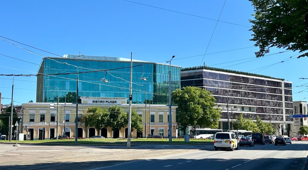 Tallinn was celebrating 100 years since they hosted the Olympics with posters that mentioned all the Olympians from Estonia pictured with their medals. Old building bottom left with new on top.