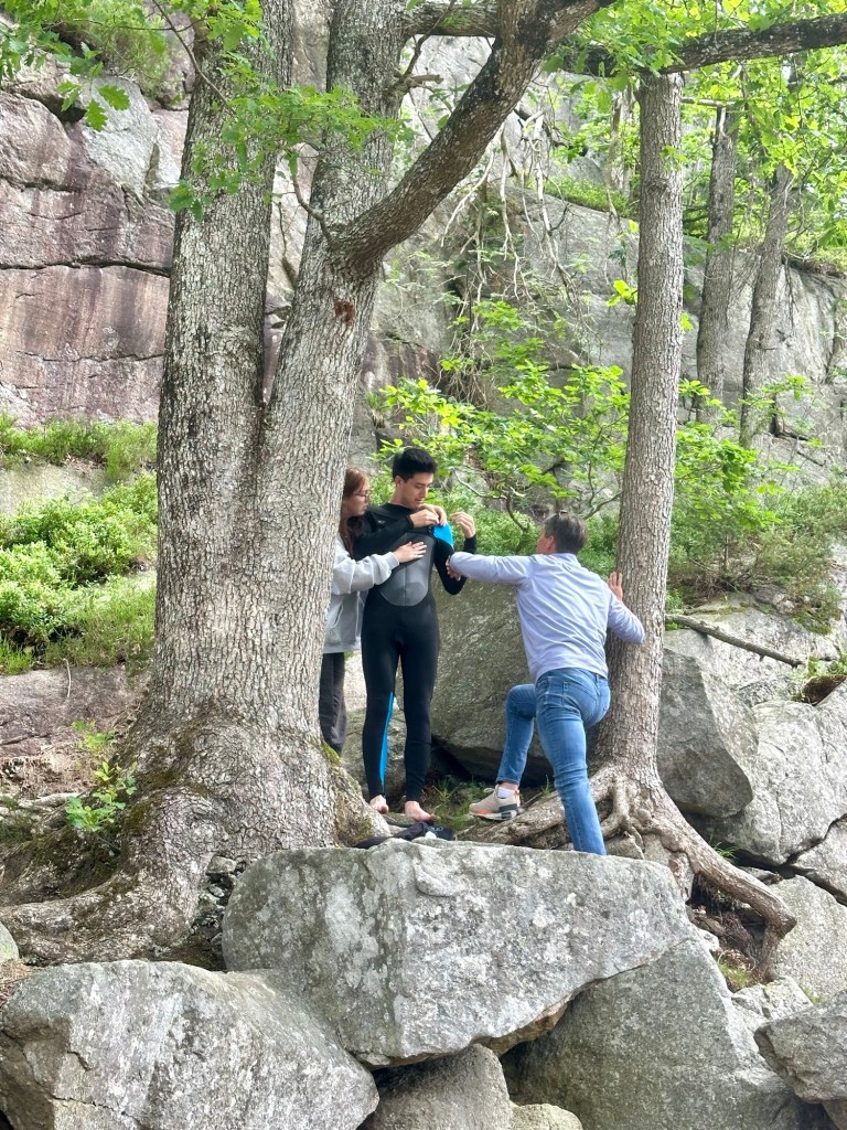 After some assistance with getting the very tight wetsuits on they were ready to go. Philip went first followed by Logan and then Jake.