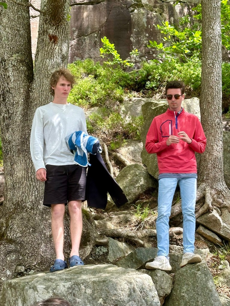 Two American men and a Norwegian man arrive at the river to swim with two wetsuits. You can guess which ones used the wetsuits.