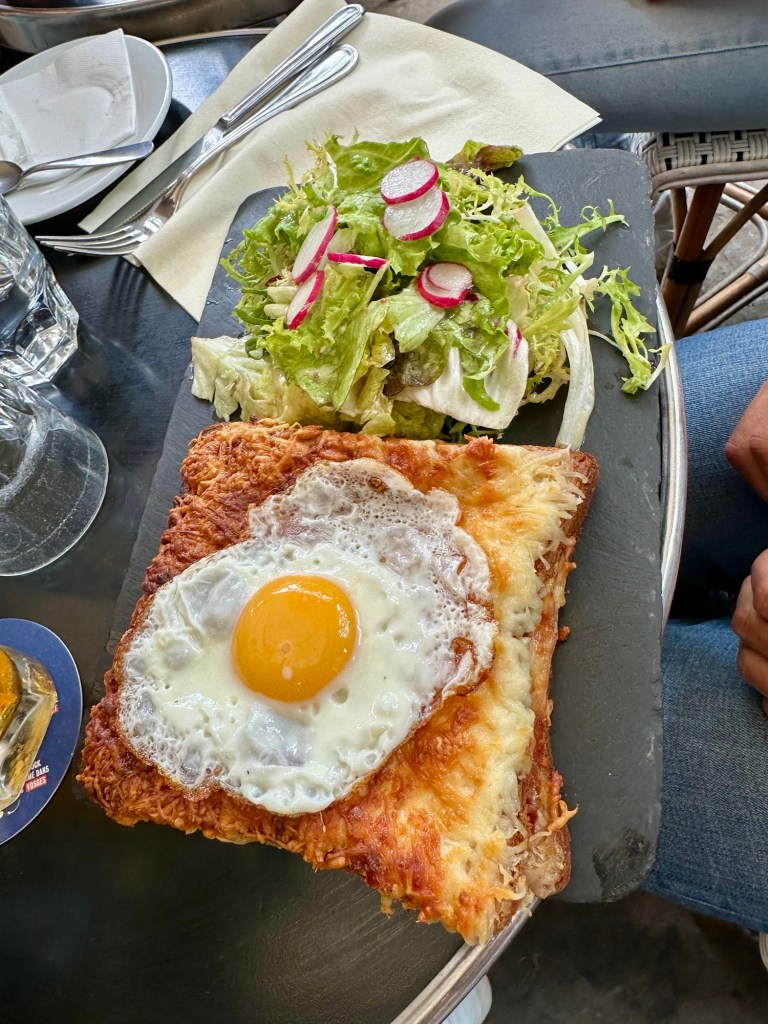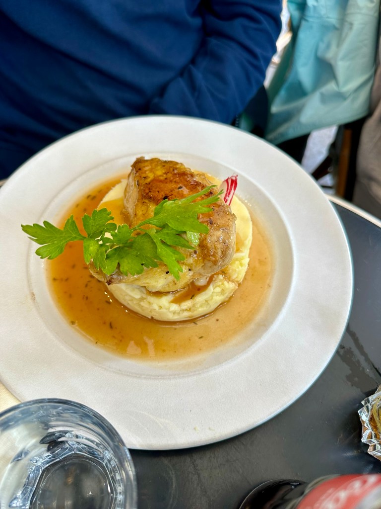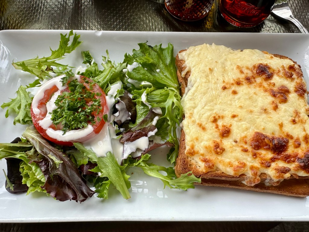 Logan’s chicken and mashed potatoes. Brooks had a Croque Monsour and Jake ate a salad.